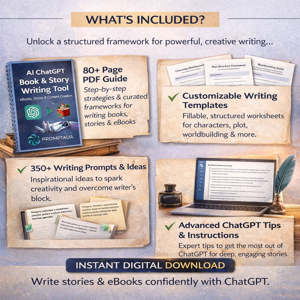 This is a digital download with instant access after purchase. Use it alongside ChatGPT to streamline your story and eBook writing process, save time, and produce consistent, high-quality content with confidence.