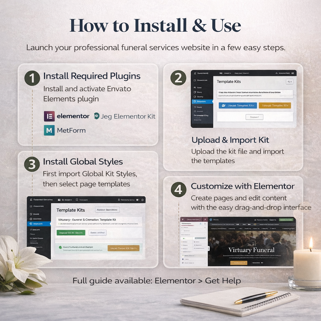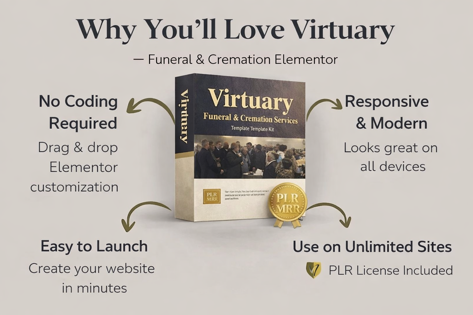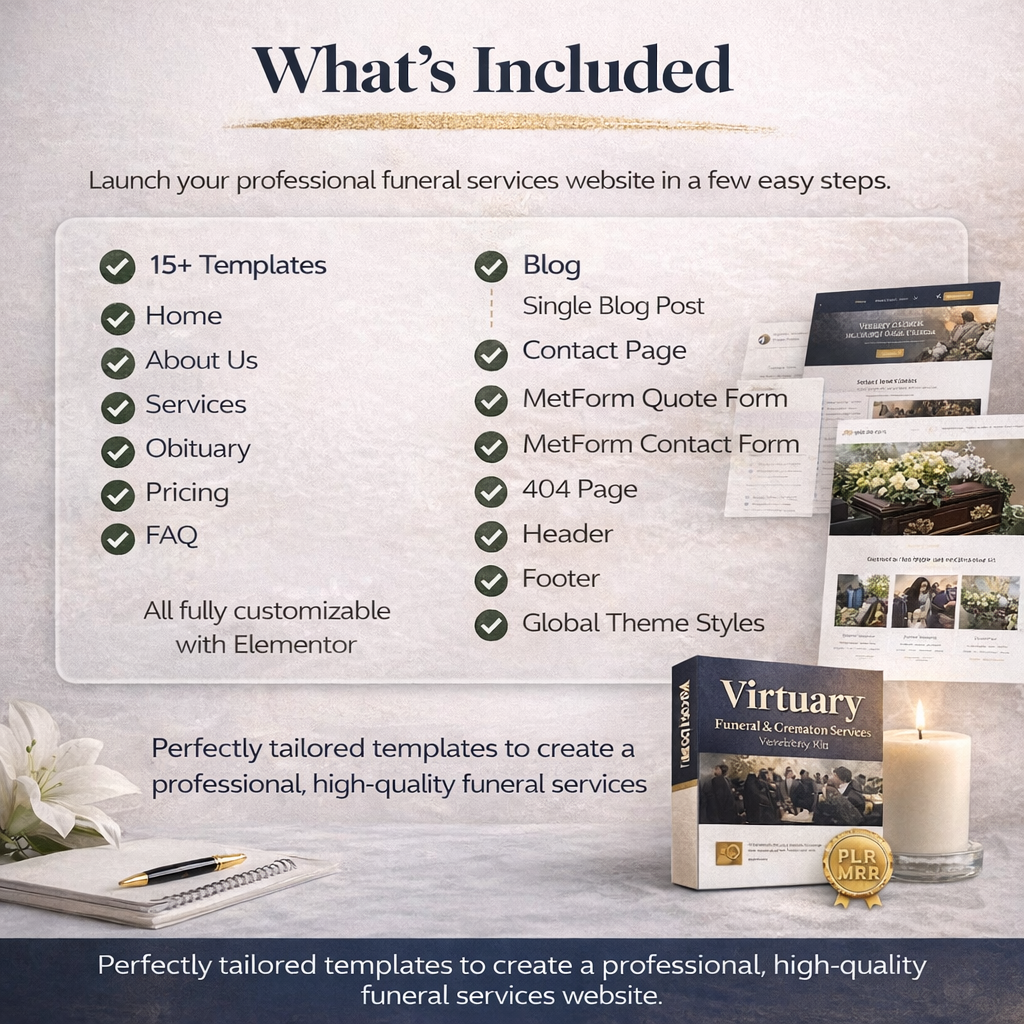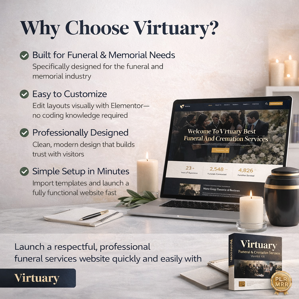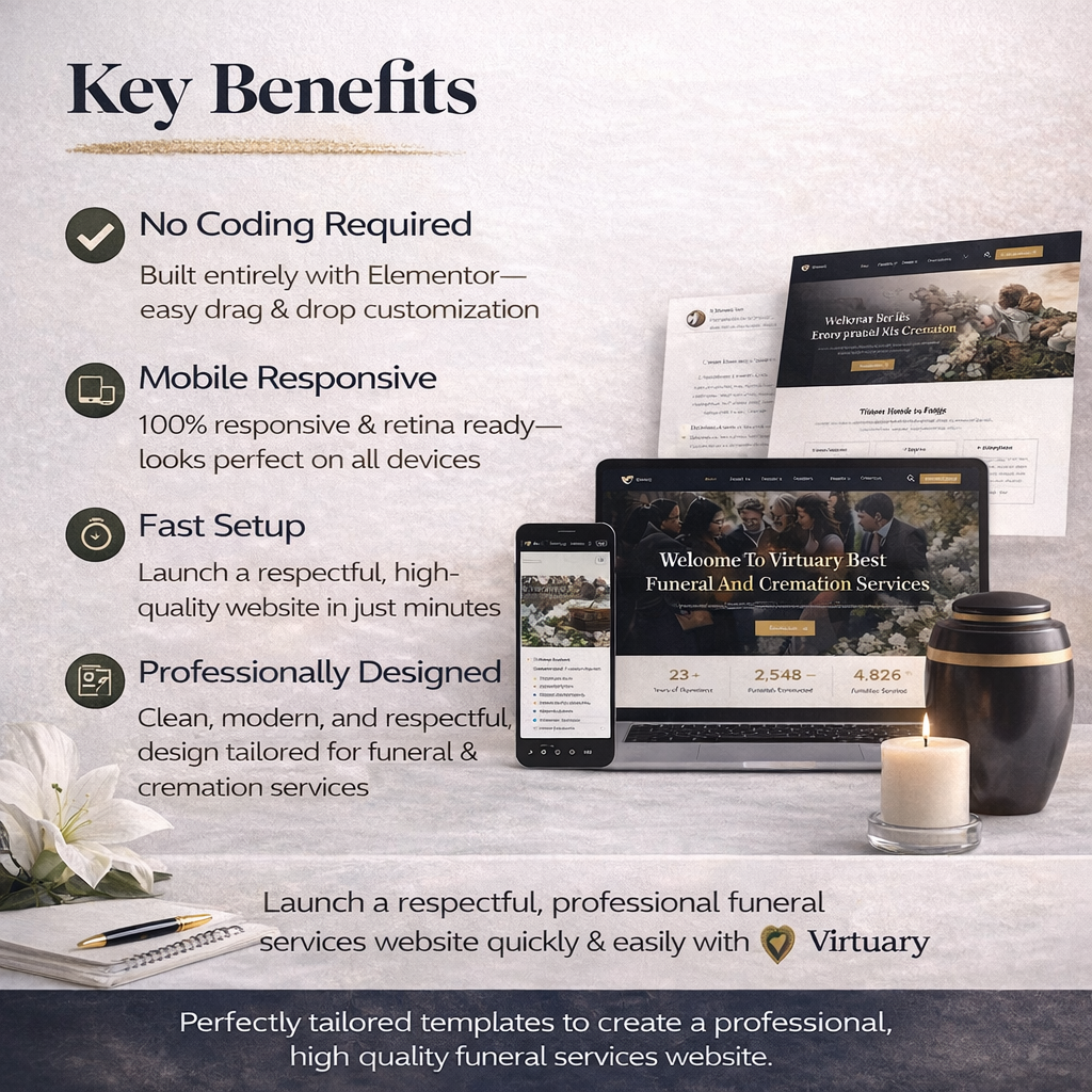 Create a calm, respectful, and professional online presence with Virtuary, a modern Elementor Template Kit designed specifically for funeral homes, cremation services, cemeteries, and memorial providers.